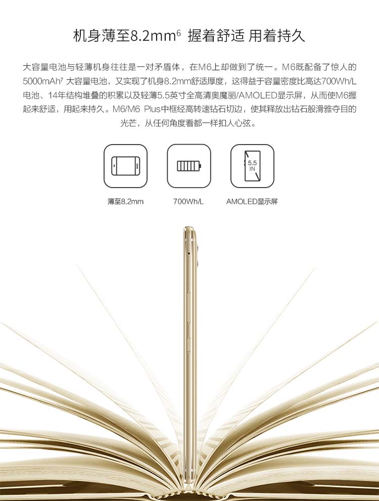 M6既配備了驚人的大容量電池,又實現了機身8.2MM的舒適厚度,打破了大容量電池與輕薄機身矛盾體的傳統。
