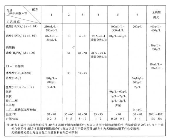 銅和單相銅合金,可以在磷酸.硝酸.醋酸或硫酸.硝酸.鉻酸型溶液中進(jìn)行化學(xué)拋光。其工藝規(guī)范列于表2—4—5。